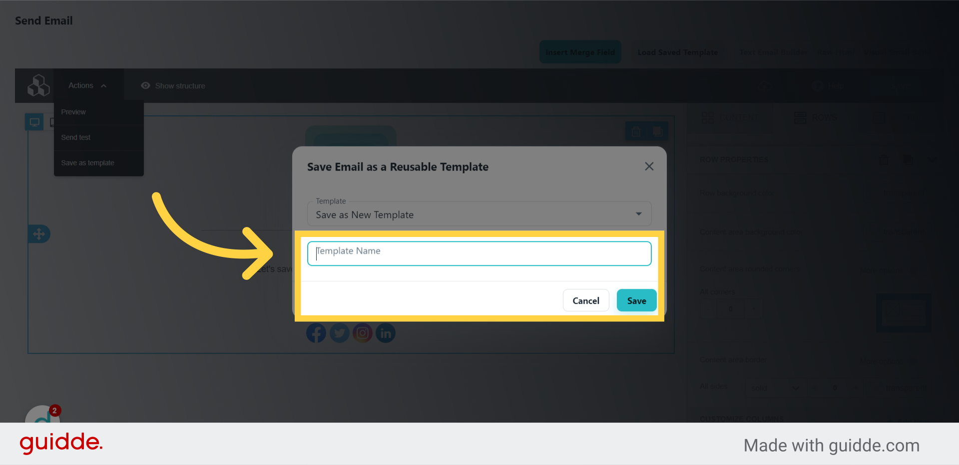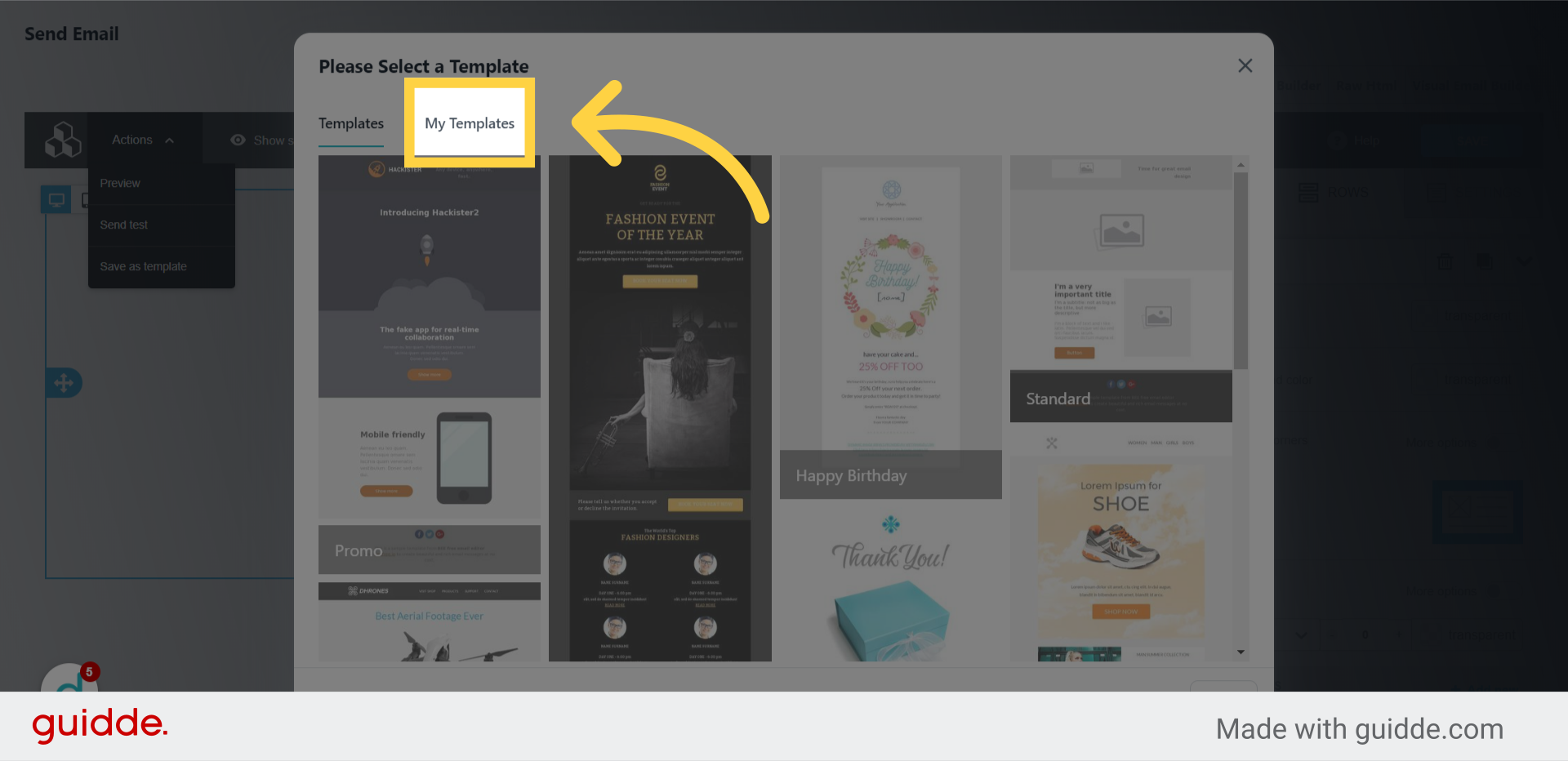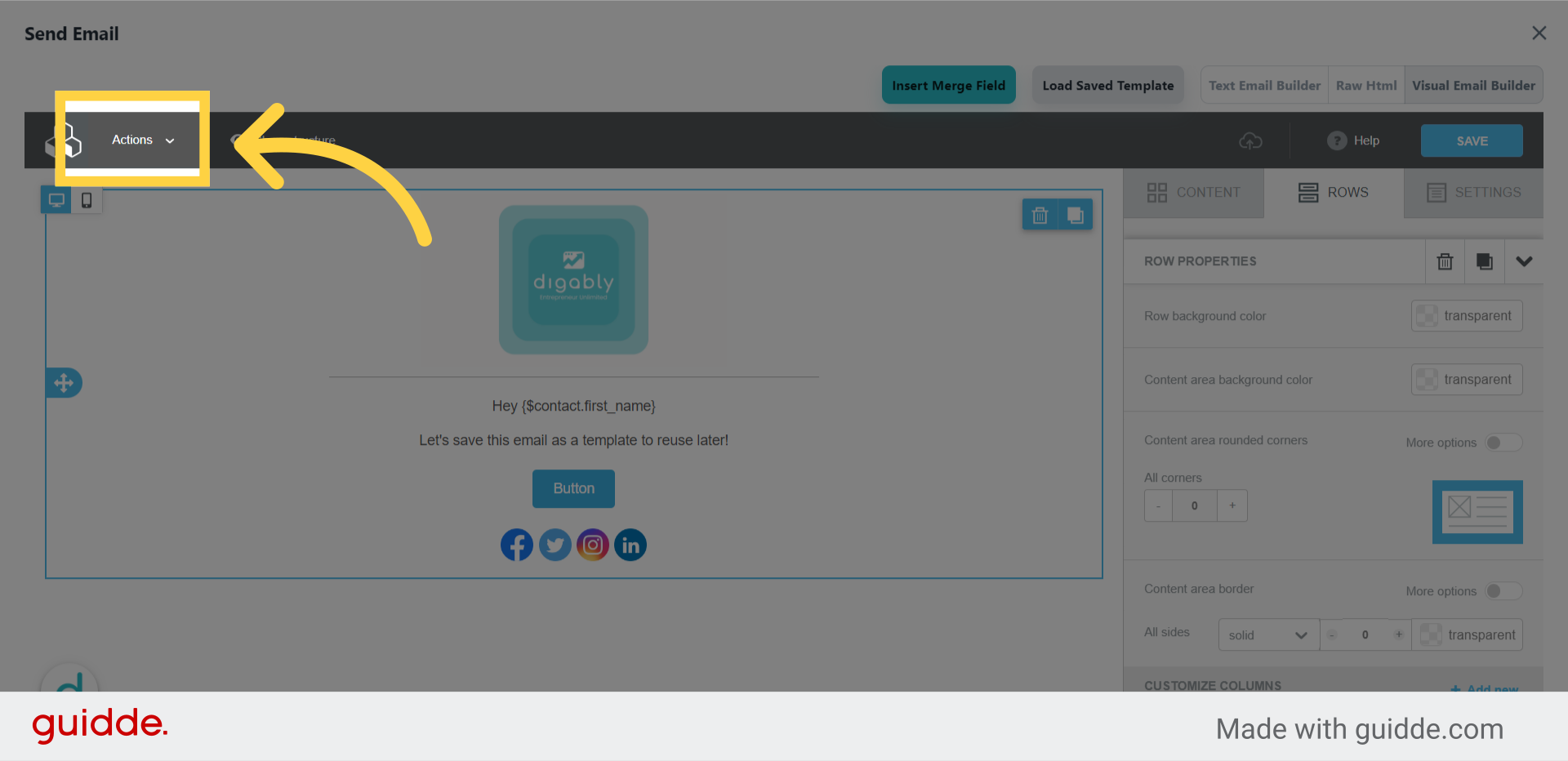 Let's start inside the visual email builder. After you have created an email that you would like to save as a template, click "Actions" in the upper left of the builder.