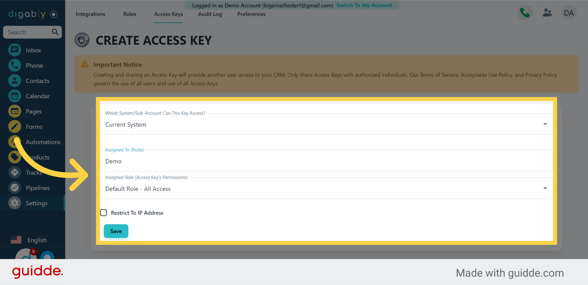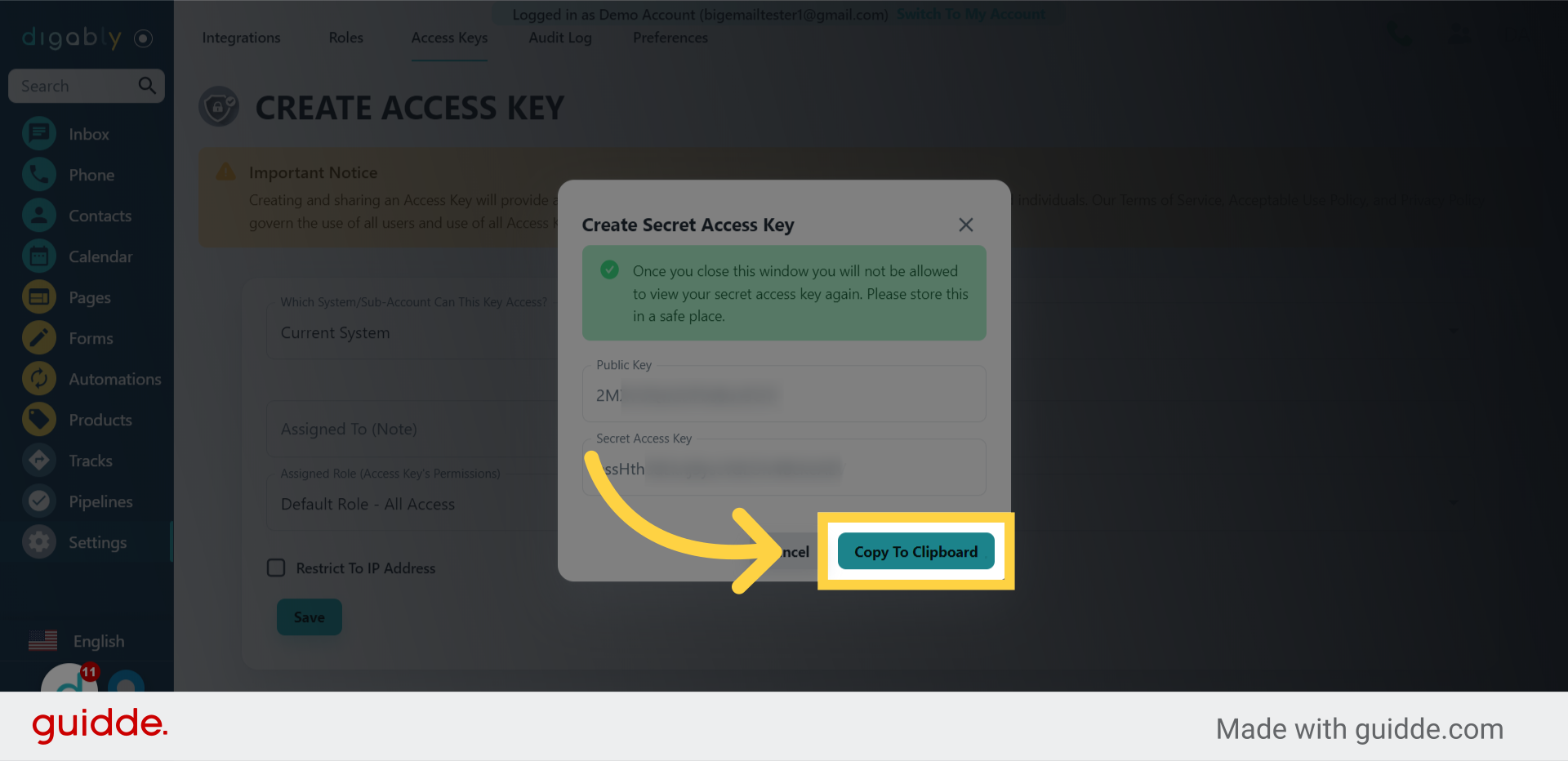 This guide covered the steps to create access keys in Digably, allowing other users to access your account.