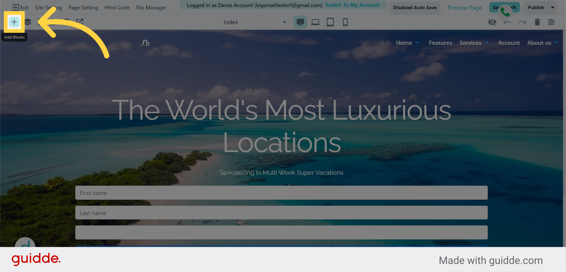 From inside the page builder, click on the "+" icon in the upper left to open the elements panel.