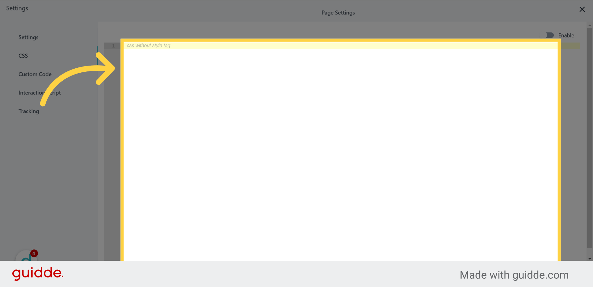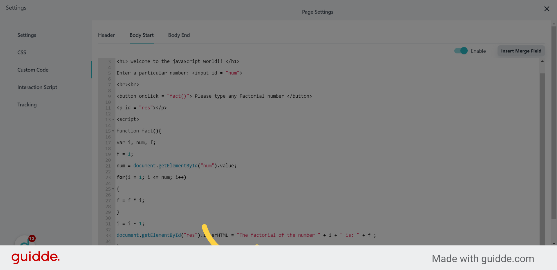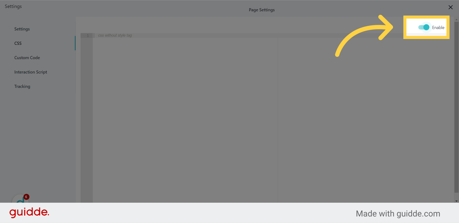 Enter your Javascript in the code editor section of the page and enable it using the toggle in the upper right.