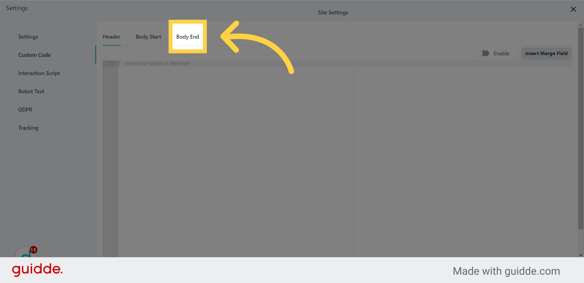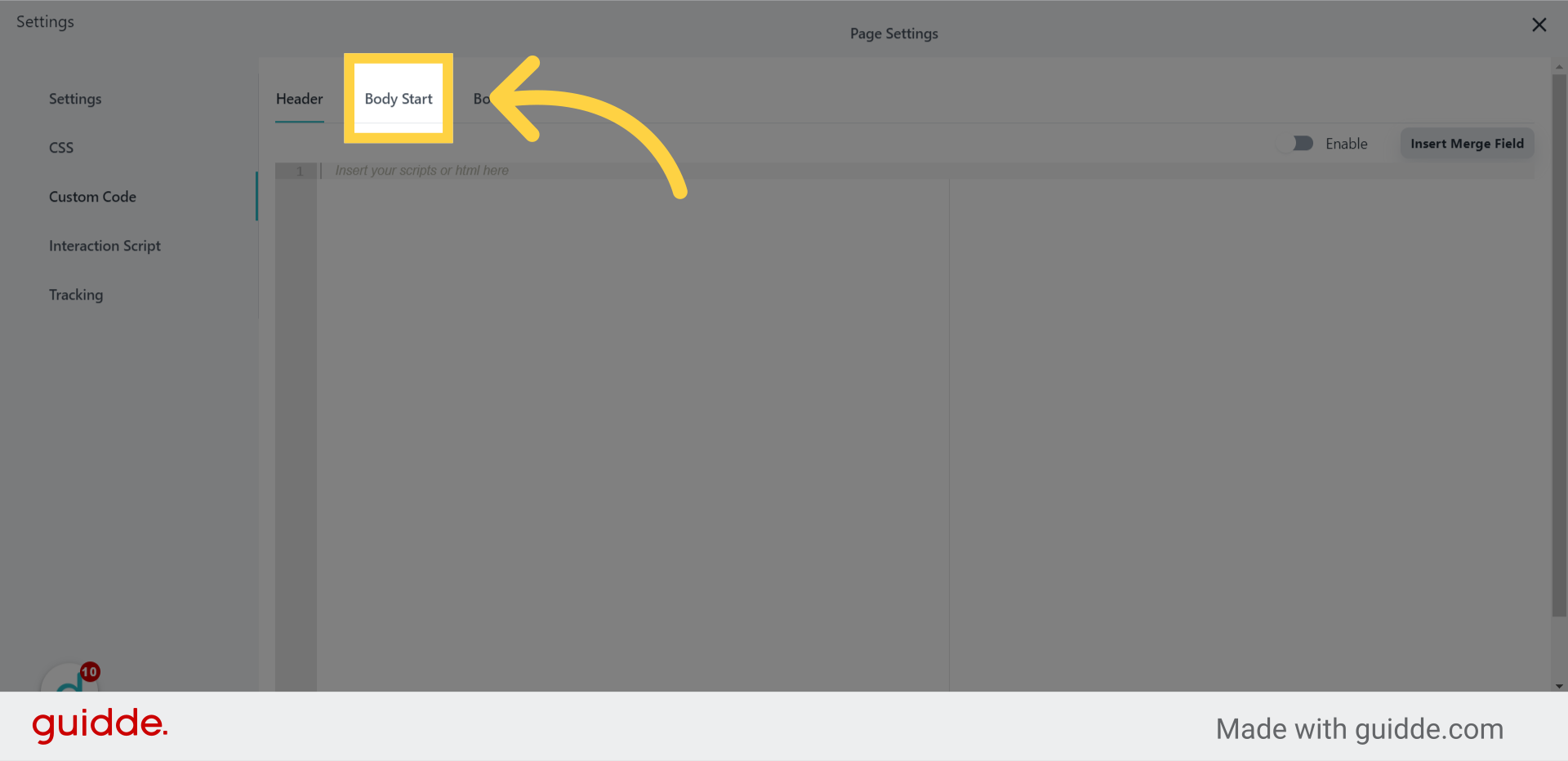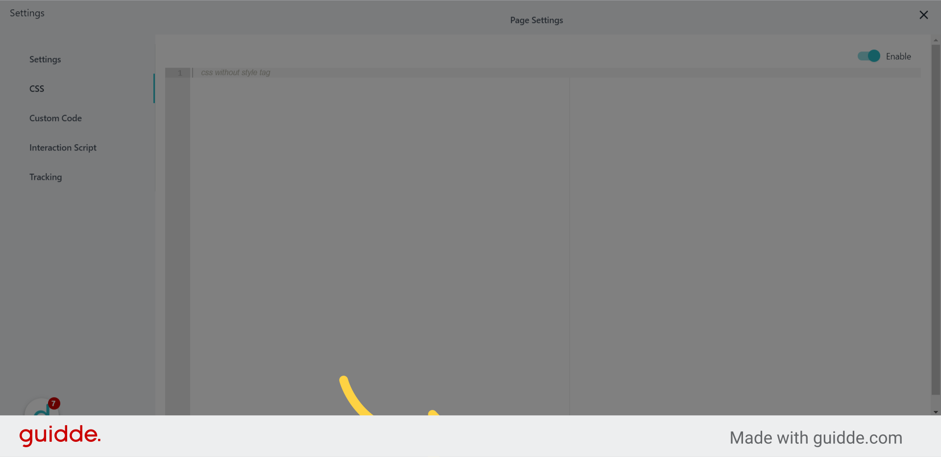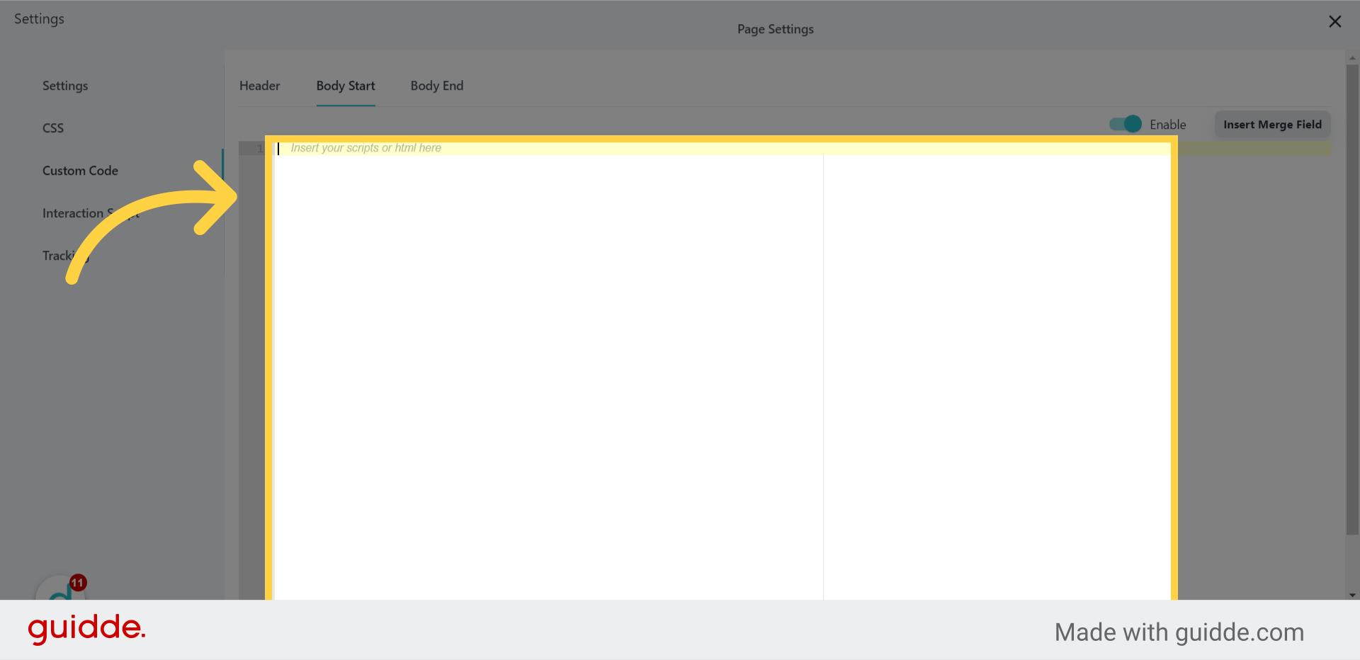 Enter your Javascript in the code editor section of the page and enable it using the toggle in the upper right.