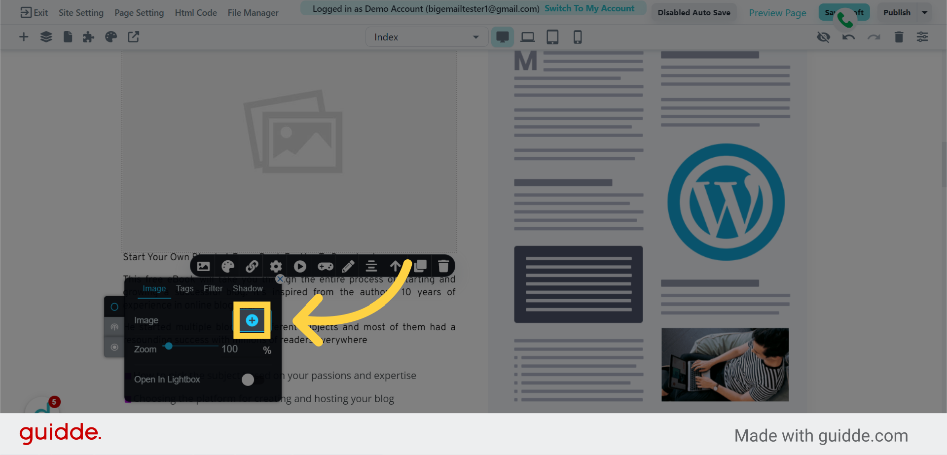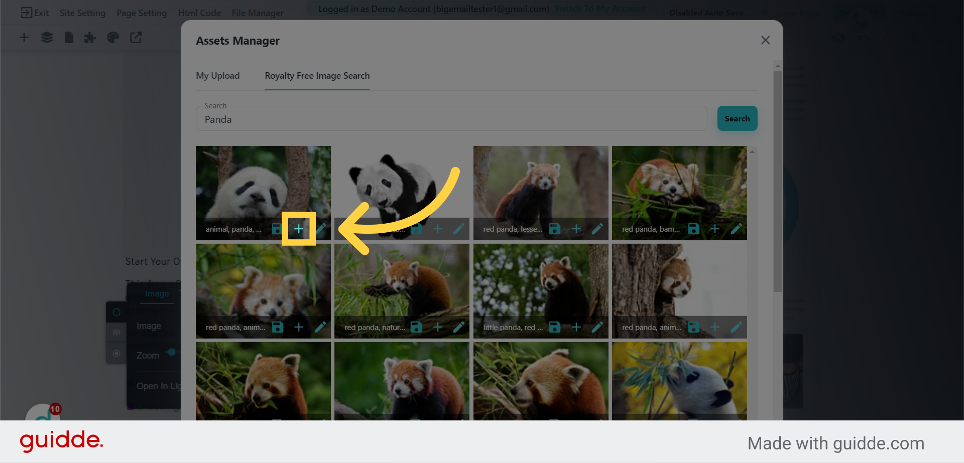 Select the desired image by clicking the "+" icon. Your image will be added to the page.