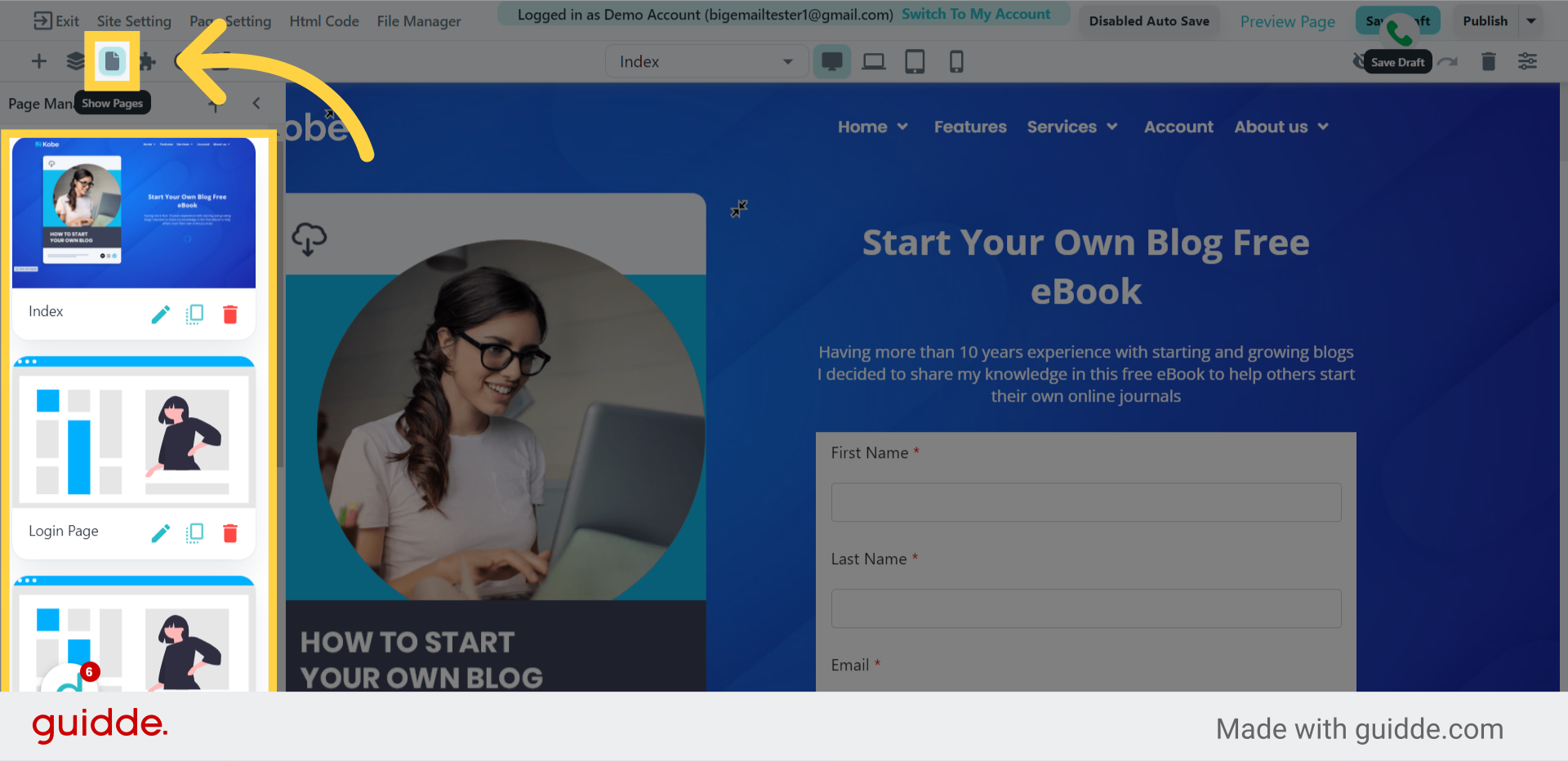 By clicking on the "Show Pages" icon in the upper left, you can now see that additional pages have been added to your site. These pages include a login page, forgot password page, and welcome page.