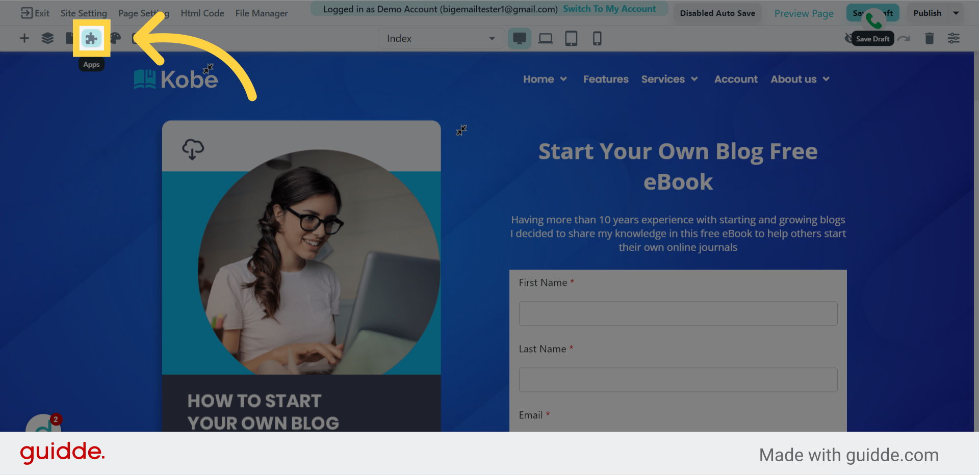 Locate and click on the "Apps" icon in the upper left of the page builder. It's shaped like a puzzle piece.